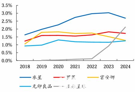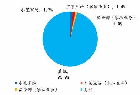 弗若斯特沙利文数据显示,2024年家纺市占率第一为水星家纺,市场份额占比达1.7%,其他两家龙头品牌罗莱生活、富安娜家纺业务市占率分别为1.4%、1.0%。家纺行业竞争格局分散的局面一直没有得到改观,主要源于家纺行业进入门槛较低,规模化成本与管理难度均较高等因素导致。