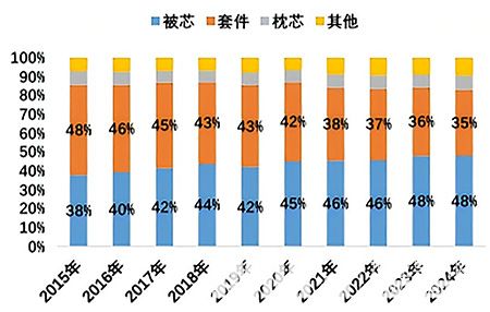 数据显示,2024年被芯产品在水星家纺收入占比为48%,打造的超级大单品已深入人心。此外,水星家纺还覆盖枕芯、套件、小单件等全品类家纺产品,以被芯为主品类先打透一个点,再带动其他品类。正如水星家纺年报表示:通过被芯品类这一个点的突破带动家纺产品一个面的发展。