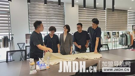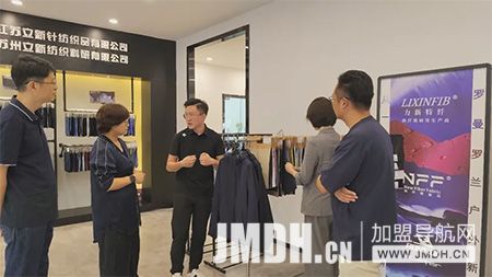 罗曼罗兰针织产品总监施冠杰向调研组详细介绍了针对不同季节的功能性针织创新产品的研发方向。