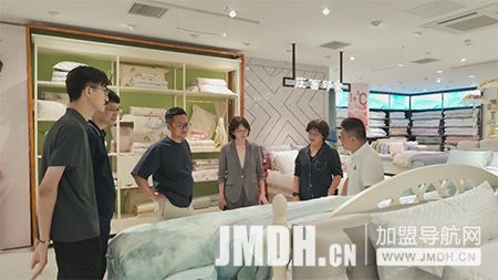 董事长徐德荣先生向调研组重点介绍了罗曼罗兰家纺一款‘寐·迷雾森林’4四件套,采用天然植物纤维,32%棉+68%再生纤维素纤维,亲肤透气,将简约设计融入自然美学,为客户打造舒适清新的卧室体验。